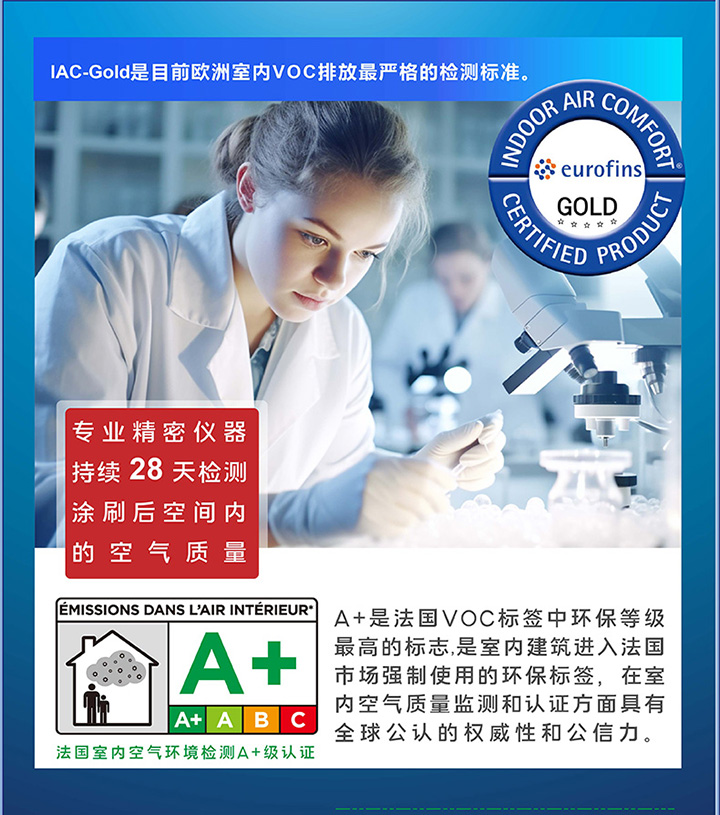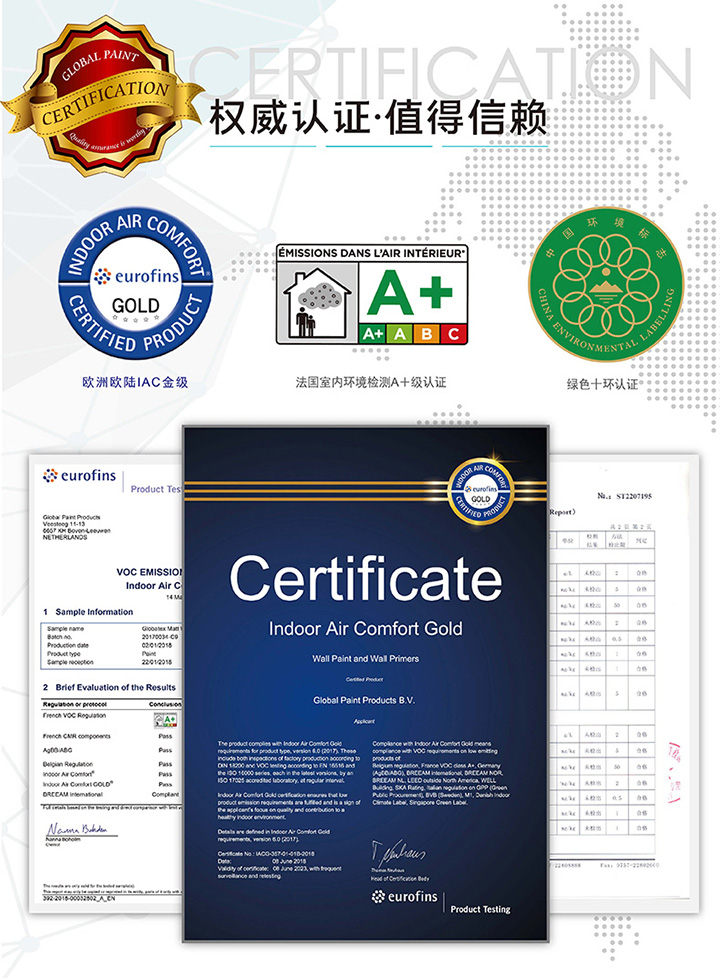 源自荷蘭,秉承歐洲綠色理念,通過嚴(yán)苛的歐陸IAC-GOLD金級(jí)認(rèn)證及法國A+級(jí)認(rèn)證,確保產(chǎn)品安全可靠,裝修無憂。