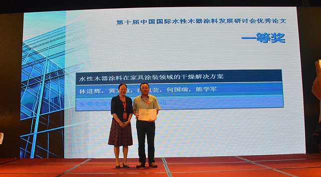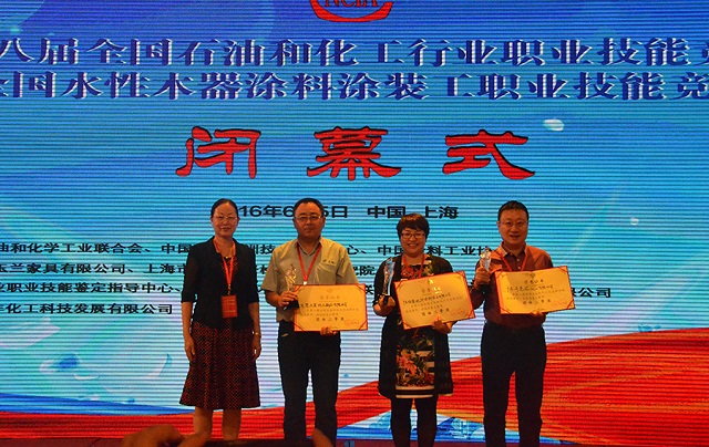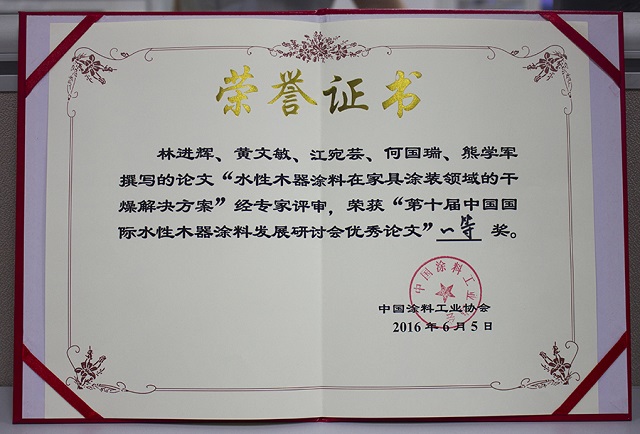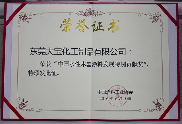 會議上表彰了一批十年來在推動中國水性木器涂料產業化進程中做出特殊貢獻的企業和個人,大寶漆除了獲得“中國水性木器涂料發展特別貢獻獎”外,由大寶化工技術部林進輝等人撰寫的《水性木器涂料在家具涂裝領域的干燥解決方案》和《自交聯丙烯酸酯乳液在水性木器封閉底漆中的應用研究》還分別榮獲本次論文評選一等獎和優秀獎,大寶漆還奪得了“全國水性涂裝職業技能大賽團體二等獎”,而大寶化工工程師周光偉先生憑借多年水性涂裝經驗和精湛的技術榮獲“全國石油和化工行業技術能手”的榮譽稱號。