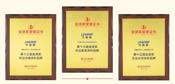 大寶漆成功在眾多品牌角逐中脫穎而出,憑借著雄厚的品牌實力,一舉斬獲“杰出內墻涂料品牌”“杰出家具涂料品牌”“杰出水性涂料品牌”三項大獎,這是大寶漆連續多年蟬聯該榜單。