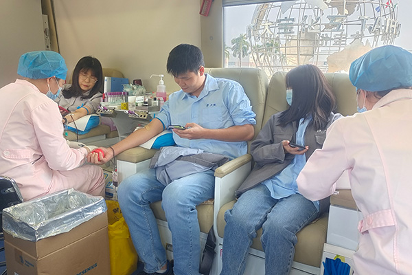 上午9時,東莞市血液中心獻血車準時到來,在醫務人員的指導下,員工認真填寫獻血登記表,測血壓、抽血化驗等前期準備工作,經血液檢驗合格后開始無償獻血,整個獻血過程有條不紊、秩序井然。