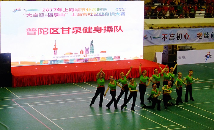 11月25日下午,由上海市社會體育管理中心、青浦區體育局、重固鎮人民政府主辦,上海大寶化工制品有限公司獨家冠名的大型市民健身操大賽——2017年“大寶漆·福泉山”杯在青浦體育館隆重舉行,來自上海市16個區22支隊伍共300多名選手匯聚一堂,在這一年一度,代表上海市社區健身操最高水平的大賽上,跳出活力,舞動申城。