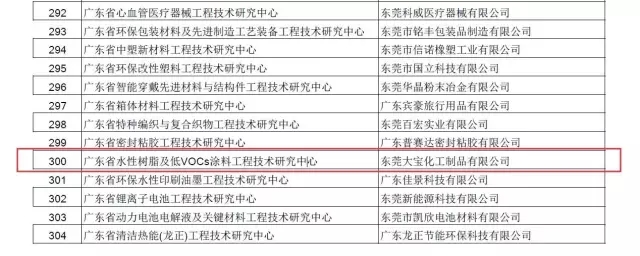 根據廣東省創新驅動發展的指示,2016年,全省科技工作將由深入謀劃布局轉入全面推進落實階段,全面深化科技體制改革,強化重點領域科技攻關和重大科技成果產業化,特別開展了“2016年度廣東省工程技術研究中心認定工作”,鼓勵企業開展基礎性前沿性創新研究。東莞大寶化工依托涂料產業創新技術、專精的科研隊伍,為“廣東省水性樹脂及低VOCs涂料工程技術研究中心”在水性、環保涂料研發技術上的突破作出了特別貢獻,獲得了廣東省科學技術廳特別認定。
