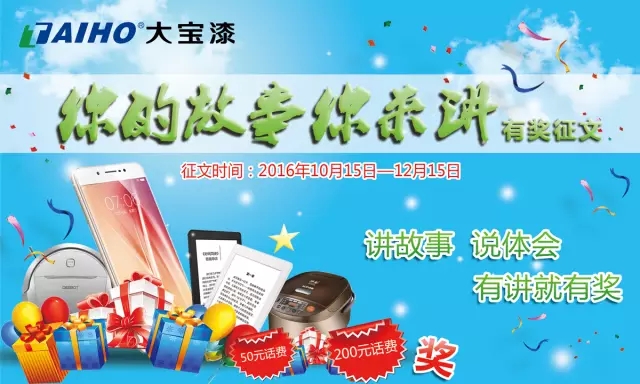 為更好地促進大寶漆各經(jīng)銷商同仁間的交流與互助,讓經(jīng)銷商同仁分享成功的經(jīng)驗,通過分享市場第一線員工的成功案例及心得體驗,并以此作為學習楷模,取其智慧精華,促使各地經(jīng)銷商同仁互補優(yōu)勢、共同提升,故大寶漆官方微信和大寶報聯(lián)合主辦“你的故事你來講”有獎?wù)魑幕顒印?