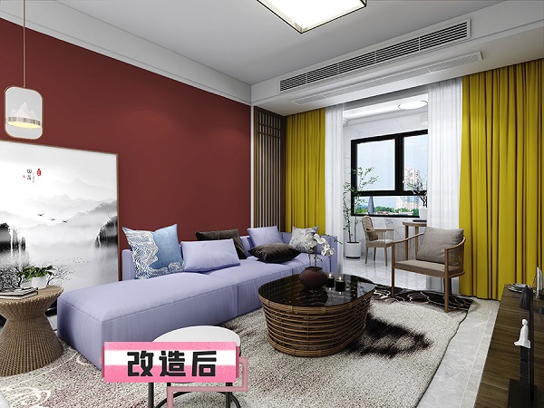 客廳墻面面積較大,更換墻面顏色對整體空間氛圍營造有明顯效果,但大紅色的彩度太高,不宜長期直視,可以刷上大寶色號R8149-32A 紅棗,換上相近色的窗簾,低彩調(diào)讓客廳更沉穩(wěn)優(yōu)雅。