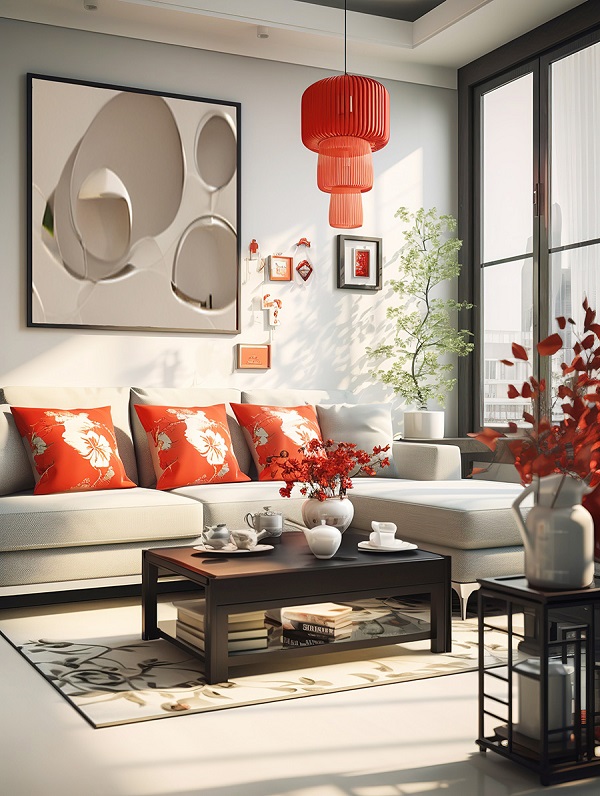 白色墻面搭配,應(yīng)景的紅色軟裝跟燈飾,極簡的空間中,增加色彩持久性,整個空間充滿活力而且極具個性。