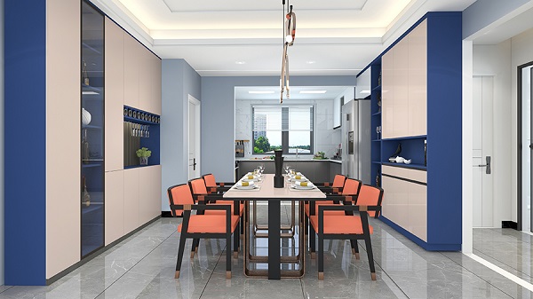 深藍或寶藍與藕粉色對比搭配,展現出視覺沖擊力。藕粉色的溫暖柔和能有效中和藍色的冷調,瞬間讓家居配色與眾不同,凸顯獨特的個性化風格,為空間注入現代感與藝術氛圍,讓人眼前一亮。